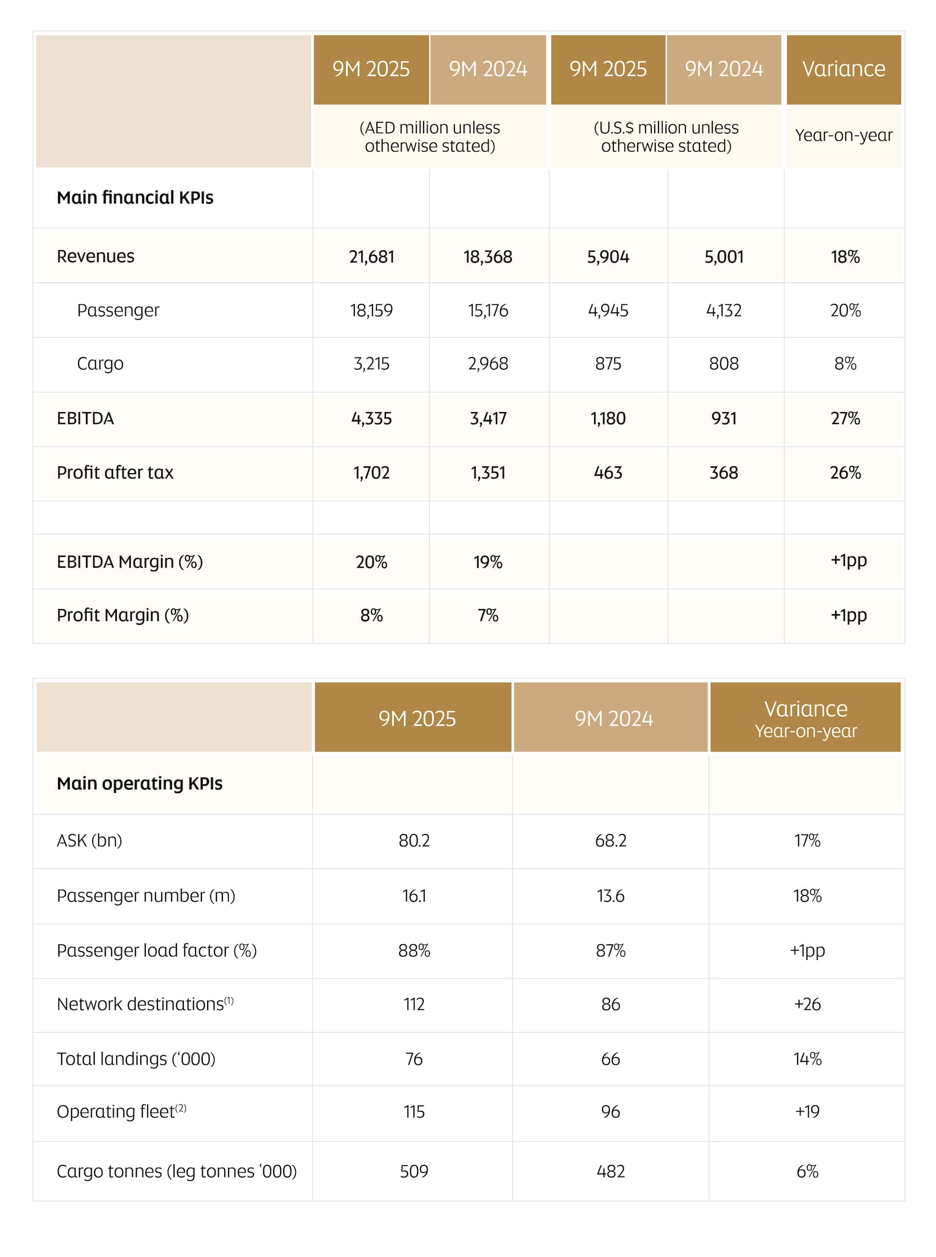 Profit after tax reached AED 1.7 billion (U.S.$ 463 million) for the first nine months of 2025, up 26 per cent compared to the same period last year, lifting the airline’s profit margin to 8 per cent, compared to 7 per cent for the same period last year.