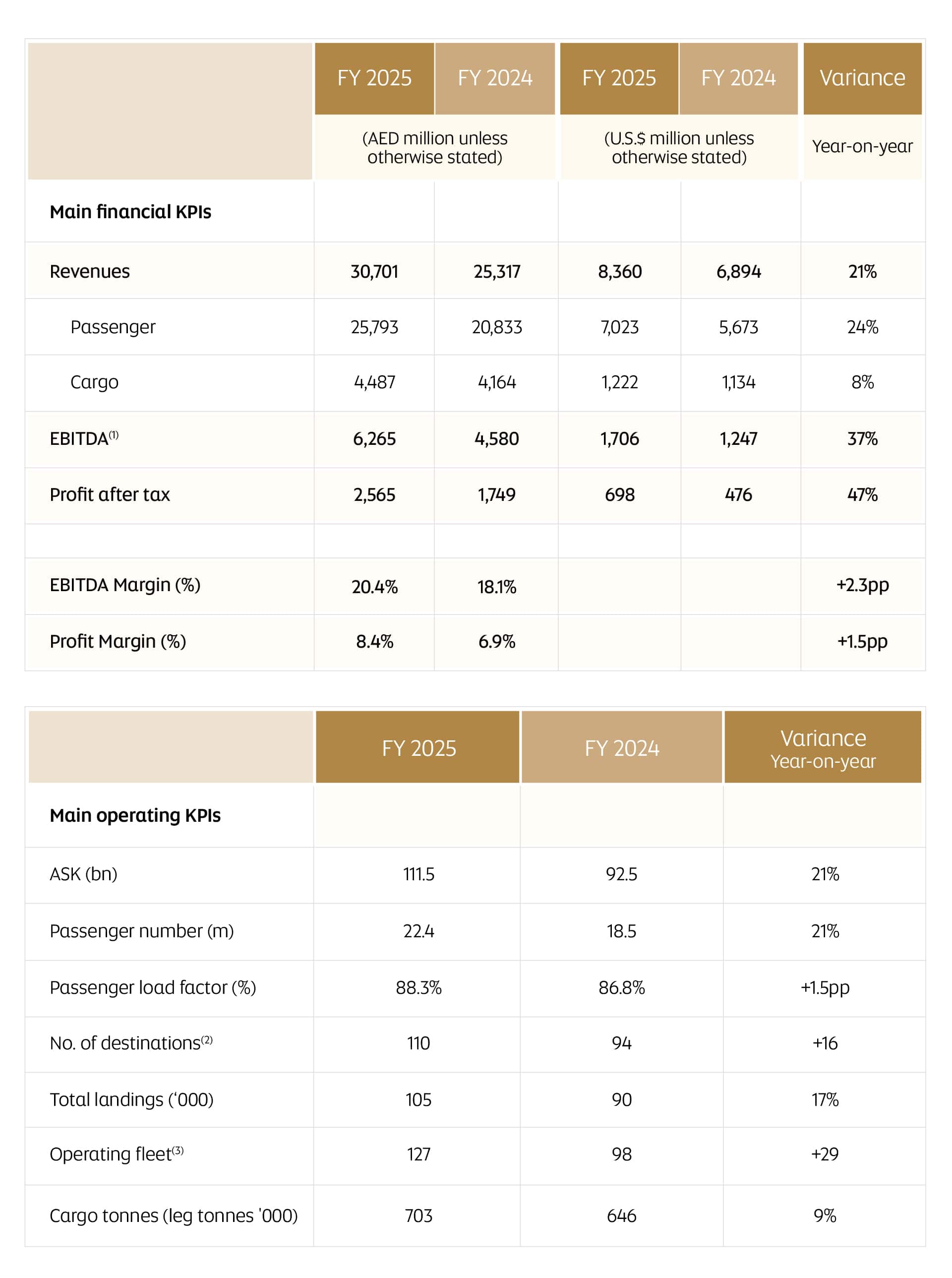 Note: (1) IFRS18 adopted starting from FY 2025. FY 2024 restated accordingly. (2) Including seasonal and cargo routes, as well as destinations scheduled to begin operation within the next 12 months. Of these, 91 were operated in the month of December 2025. (3) As of the closing month of the period. Including short-term aircraft, crew, maintenance and insurance ("ACMI") leases, FY 2024 figure restated accordingly. Operating fleet includes freighters.